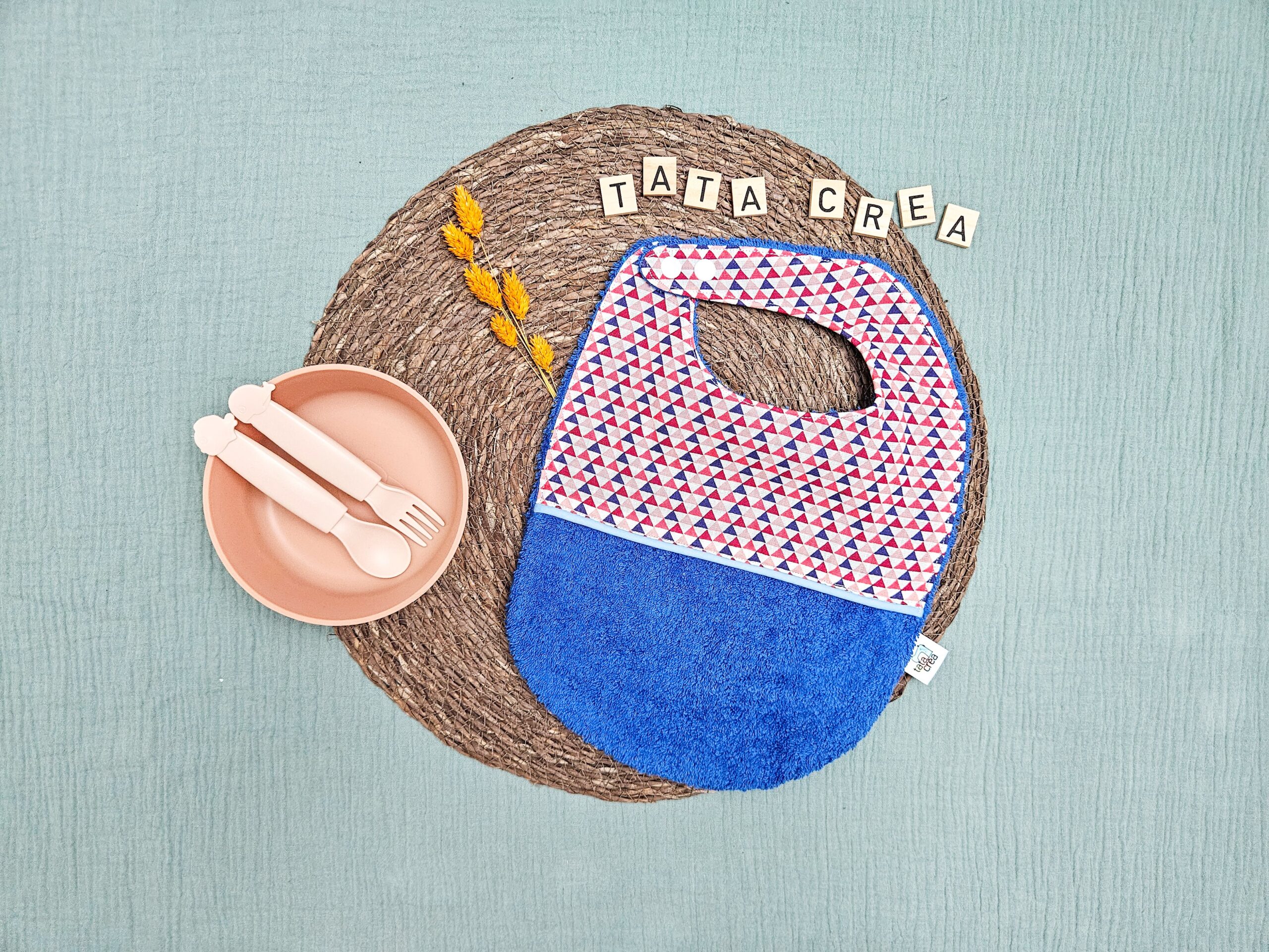 - au recto : d’un tissu à motifs « minis triangles roses », d’un liseré intermédiaire bleu ciel, et d’une éponge bleu foncé.