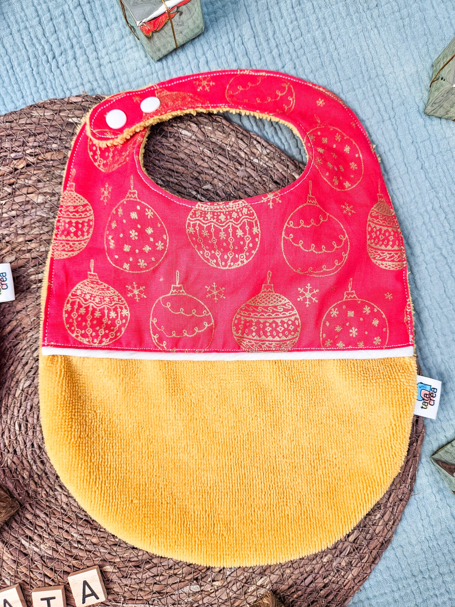 Je réalise entièrement chaque bavoir de Noël à la main dans mon atelier, avec soin et minutie. Je choisis les tissus pour leur qualité, leur douceur et leur solidité. J’associe les matières, les motifs et les couleurs pour refléter la douceur de l’enfance et le lien affectif unique que vous souhaitez célébrer.