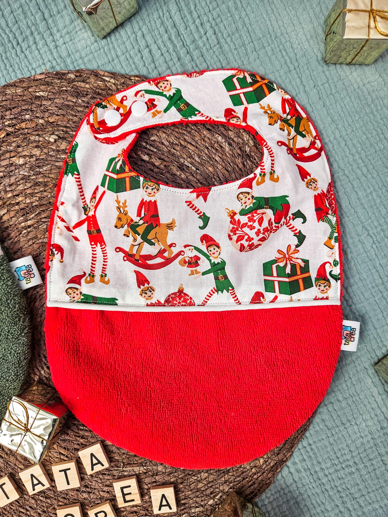 Je réalise entièrement chaque bavoir de Noël à la main dans mon atelier, avec soin et minutie. Je choisis les tissus pour leur qualité, leur douceur et leur solidité. J’associe les matières, les motifs et les couleurs pour refléter la douceur de l’enfance et le lien affectif unique que vous souhaitez célébrer.