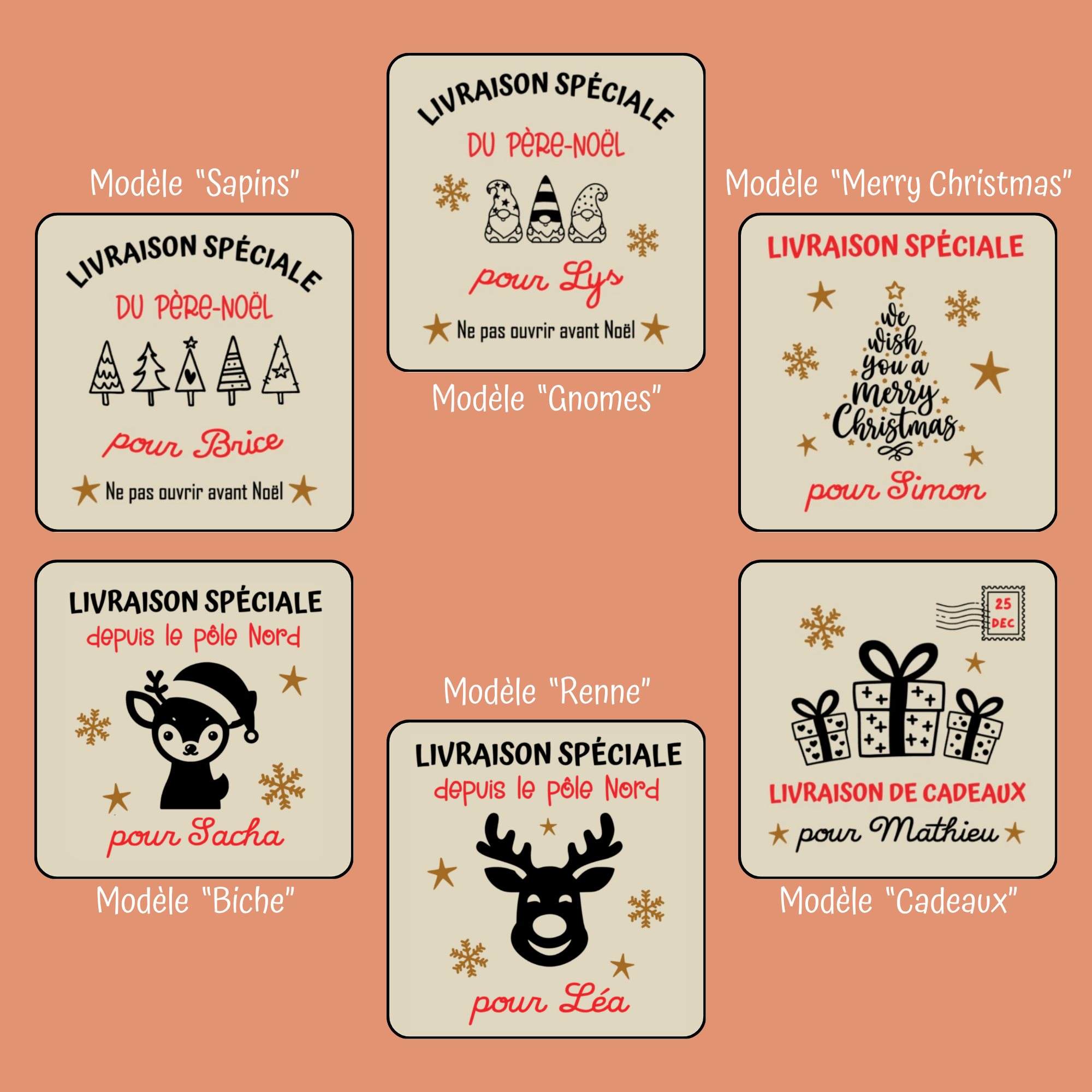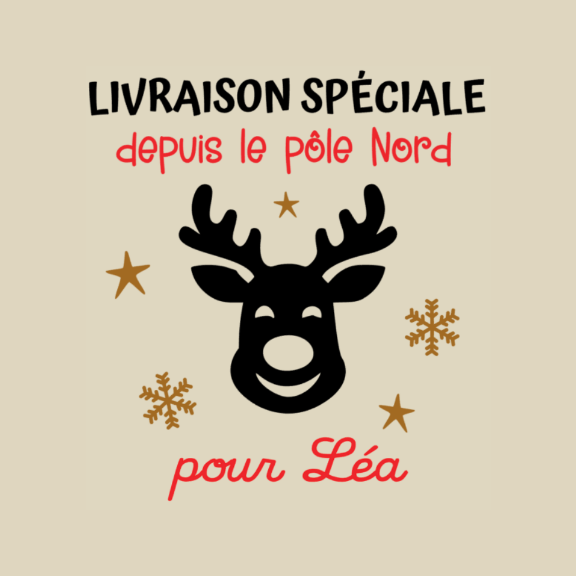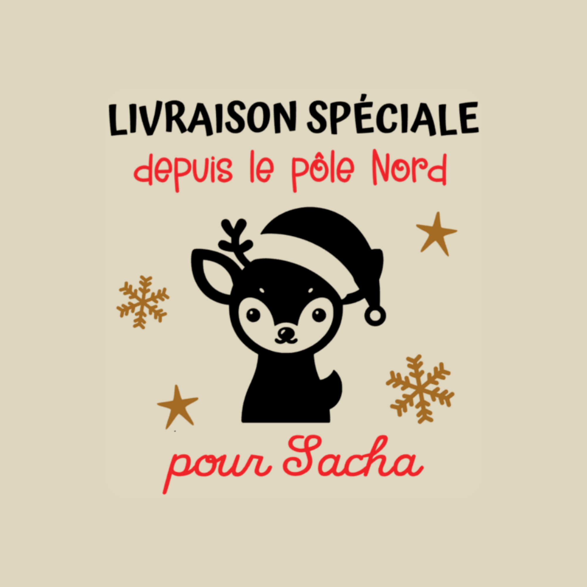 Votre hotte de Noël devient unique grâce à l’ajout du prénom de l’enfant, intégré à l’un des six visuels proposés.