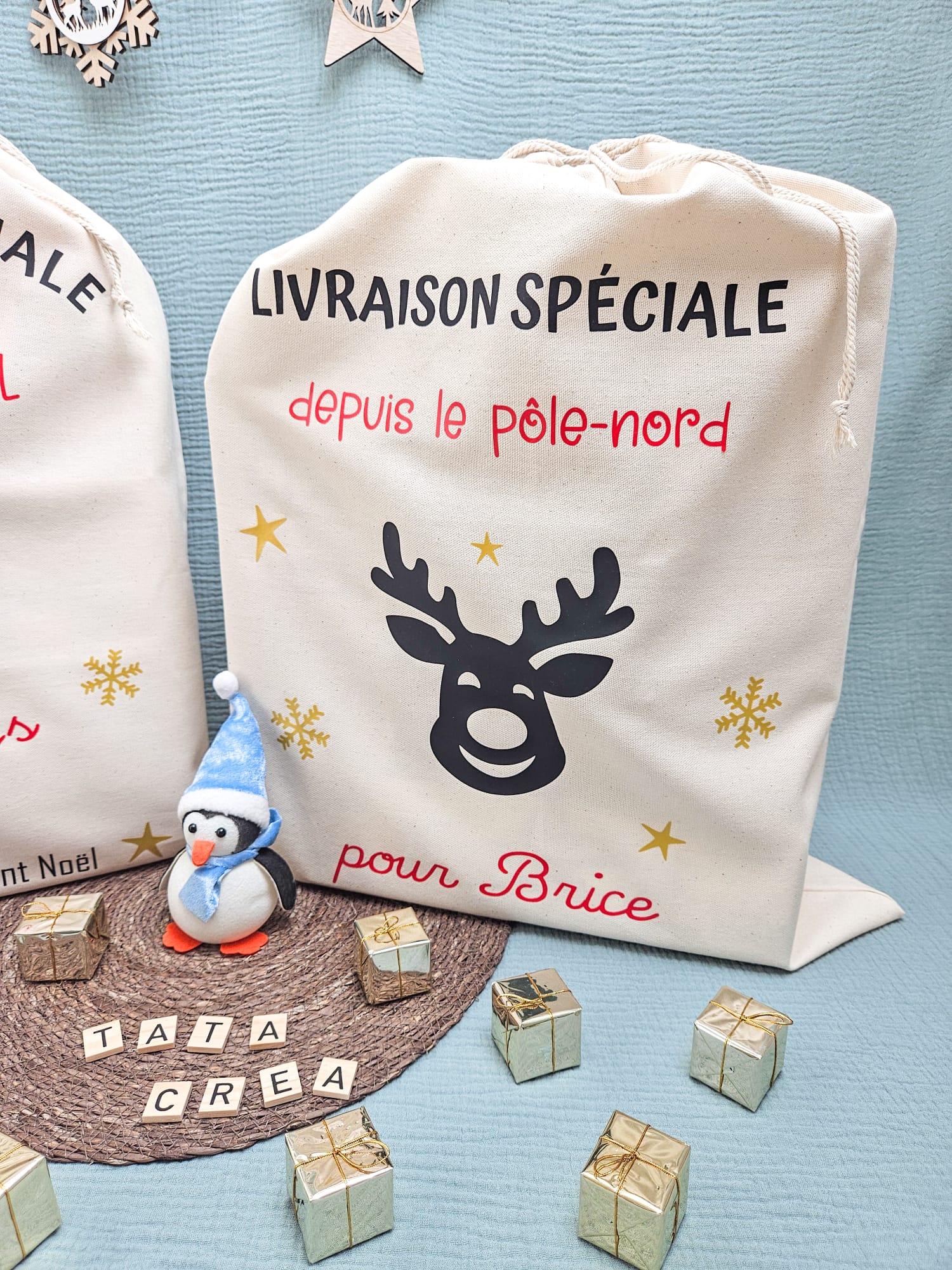 La hotte de Noël personnalisée Tata créa : la rencontre entre la magie de Noël et la praticité.