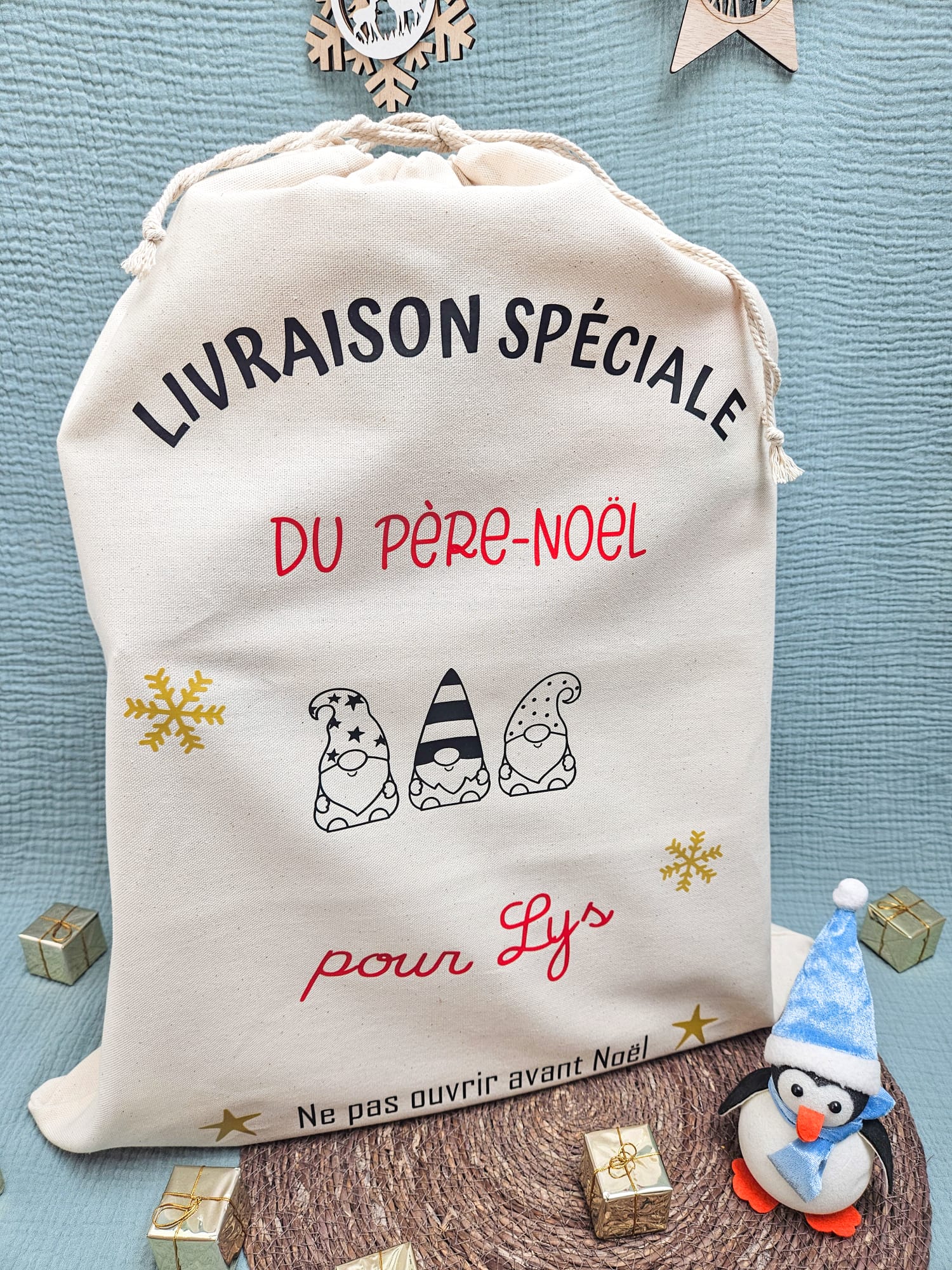 Cette hotte de Noël personnalisée mesure environ 62 cm de haut et 52 cm de large, une taille idéale pour contenir jouets, friandises et petites attentions. Elle est équipée d’un double lien coulissant beige qui permet de la fermer facilement et de garder la surprise intacte jusqu’au jour J.